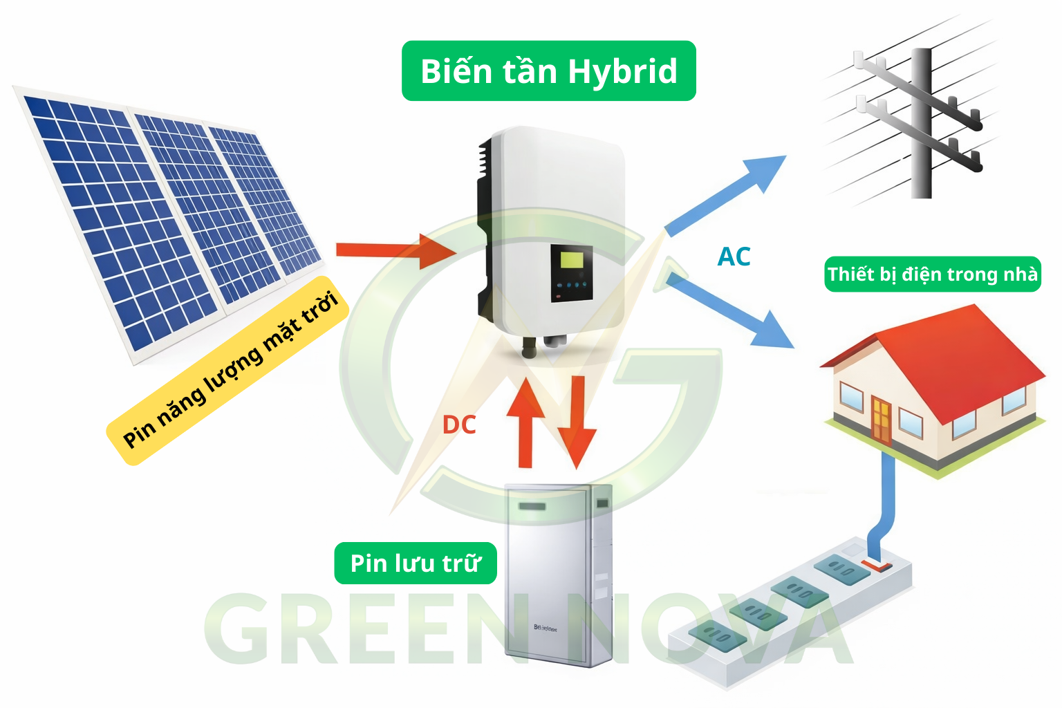 Biến tần hybrid Green Nova ưu tiên dùng điện mặt trời, chỉ lấy điện lưới khi cần thiết, giúp giảm đáng kể hóa đơn tiền điện.